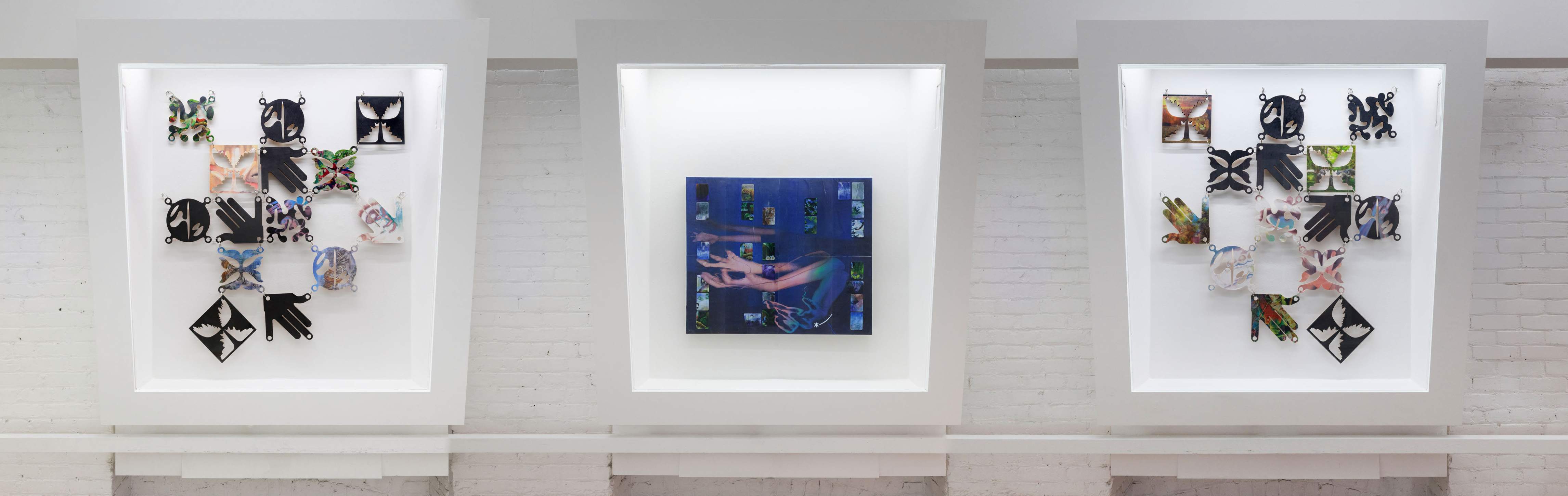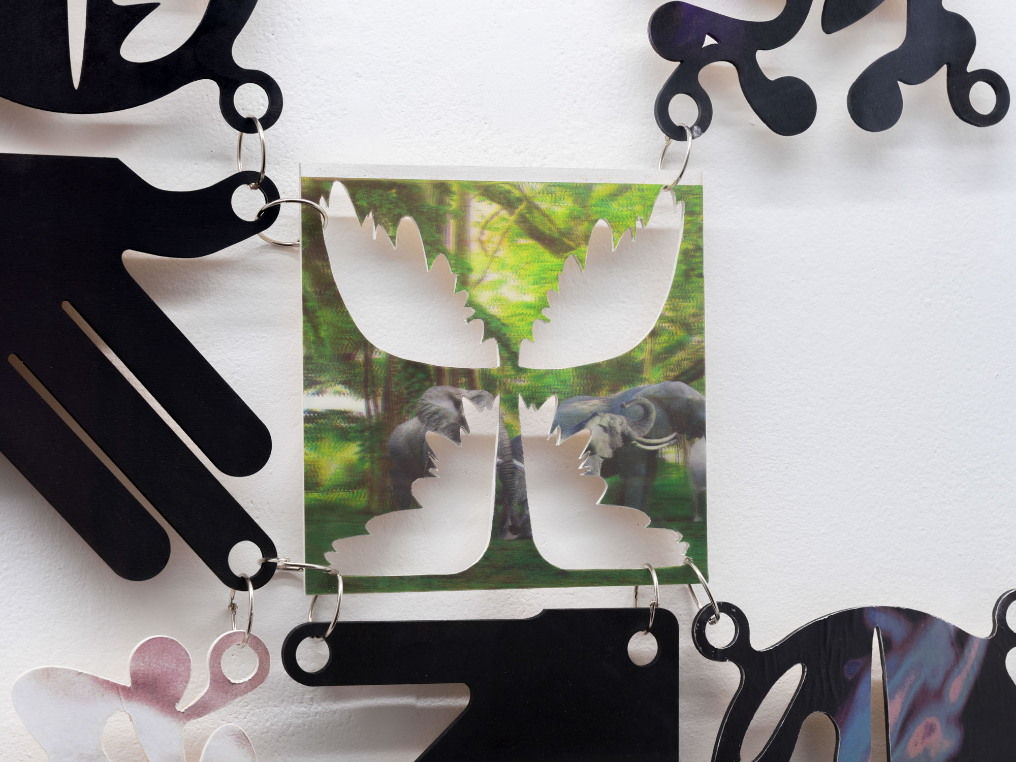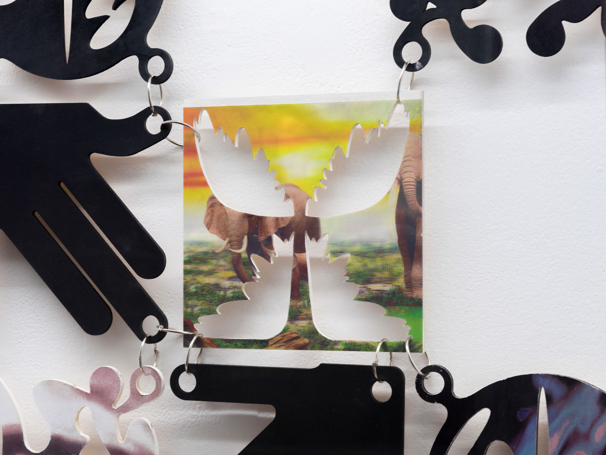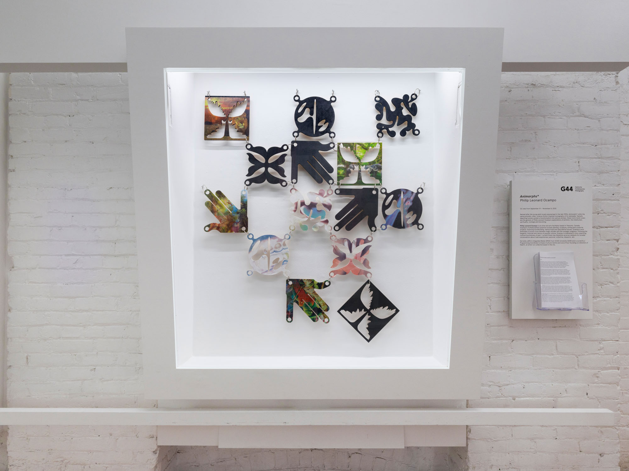 With its opening asterisk, Animorphs* begins with a glimmer, the twinkle of an eye. Symbols, gestures and layered images combine across three vitrines to create a shapeshifting array in this new work by Philip Leonardo Ocampo. At its centre, a figure turns away, arms flung backward in a pose that wavers between claws and wings. Interlaced lines of lenticular material, composed of cutout tiles printed with animal figures, shift and transform with each angle of approach. Five painted symbols are layered across the body and reappear throughout the work. Each respectively represents one of the five animal groups: amphibians, mammals, birds, reptiles and fish.