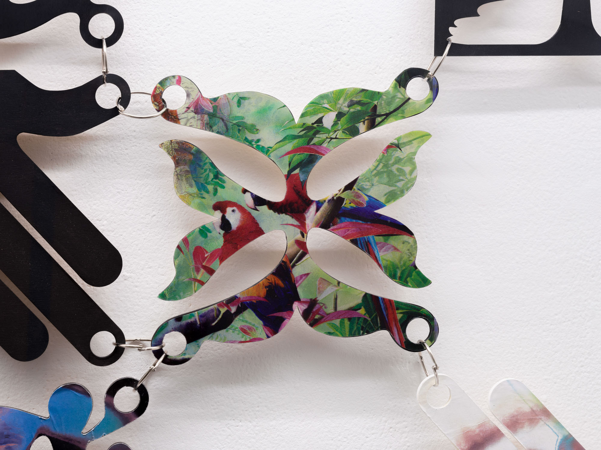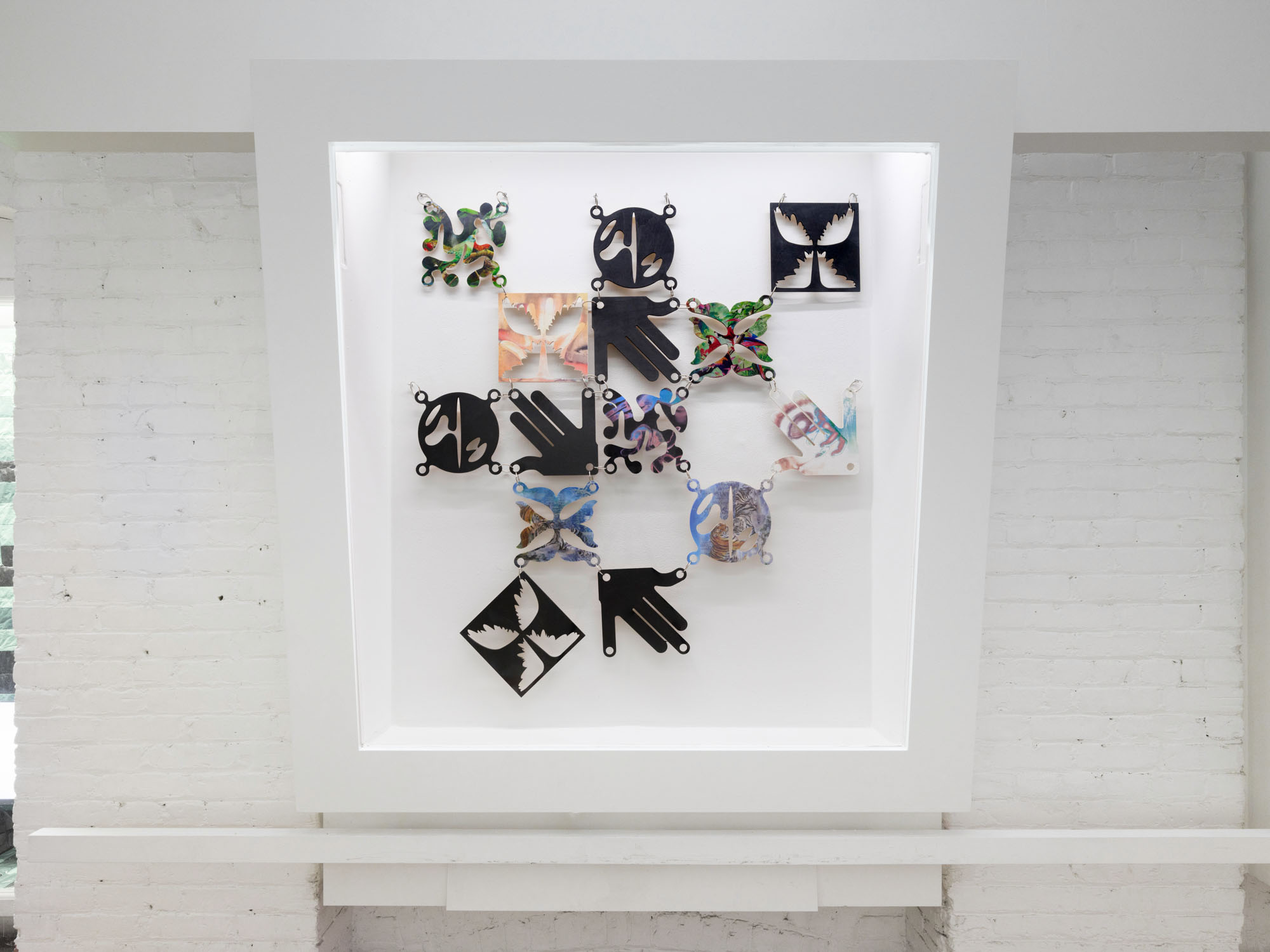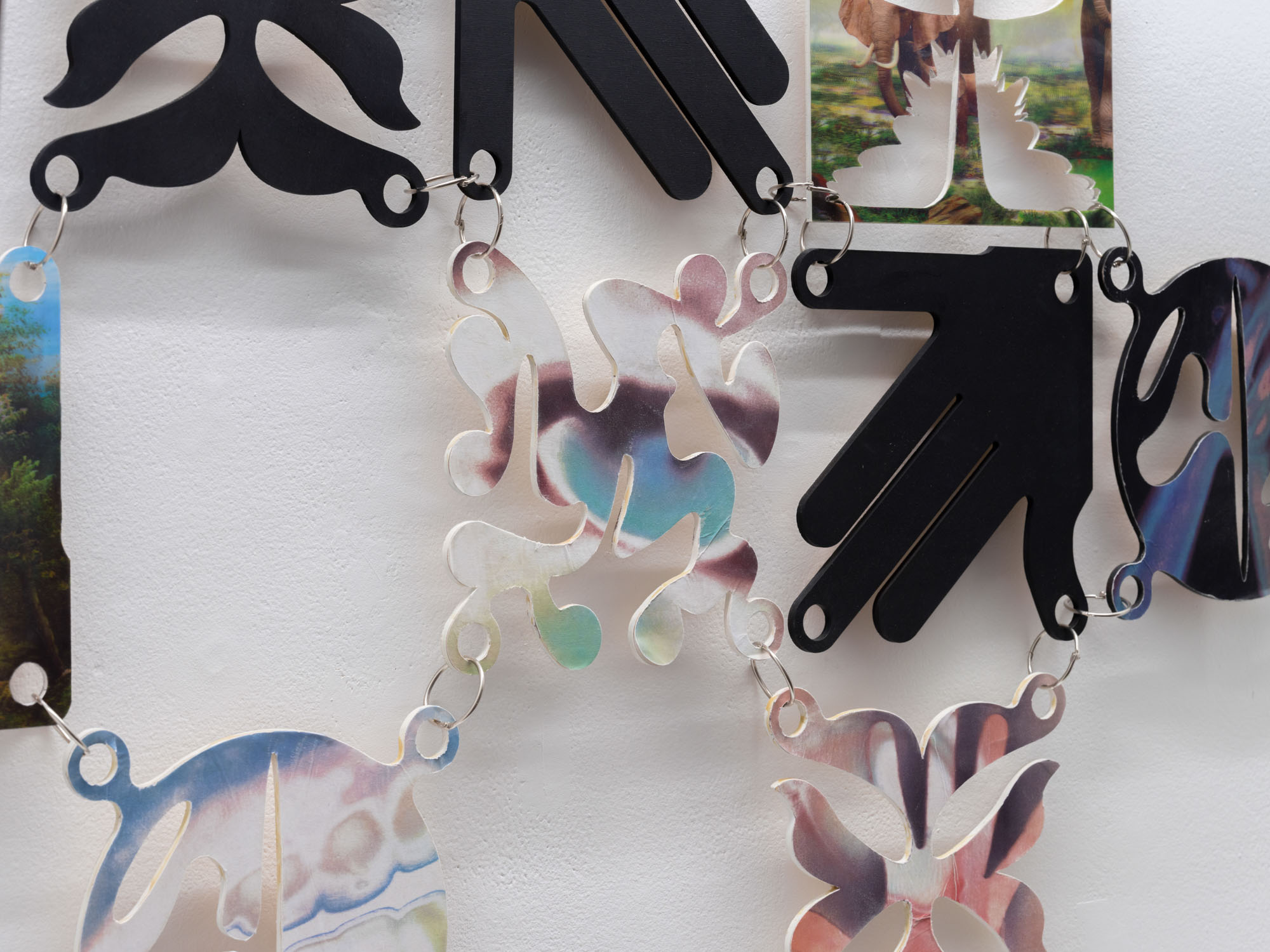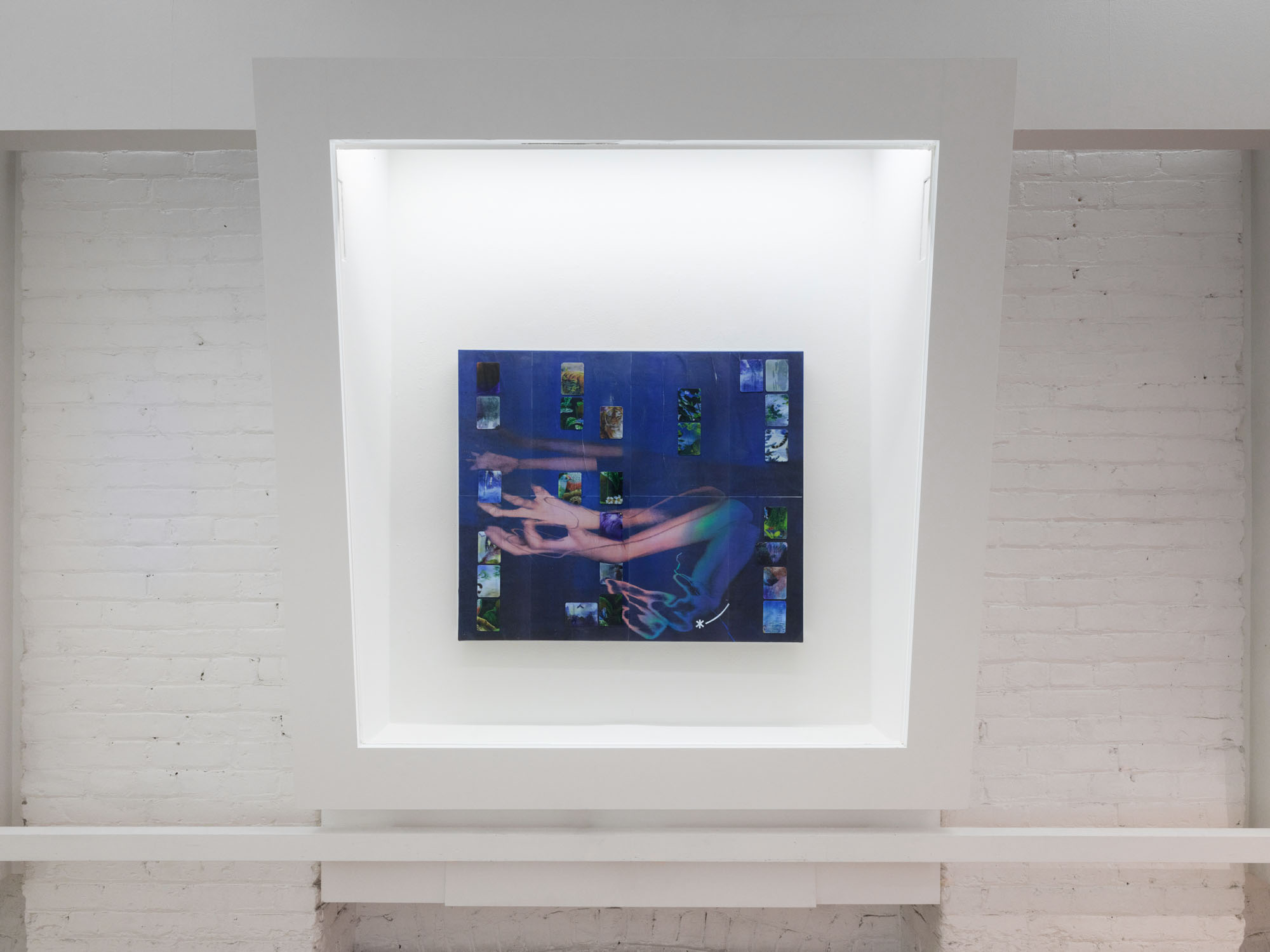 With its opening asterisk, Animorphs* begins with a glimmer, the twinkle of an eye. Symbols, gestures and layered images combine across three vitrines to create a shapeshifting array in this new work by Philip Leonardo Ocampo. At its centre, a figure turns away, arms flung backward in a pose that wavers between claws and wings. Interlaced lines of lenticular material, composed of cutout tiles printed with animal figures, shift and transform with each angle of approach. Five painted symbols are layered across the body and reappear throughout the work. Each respectively represents one of the five animal groups: amphibians, mammals, birds, reptiles and fish.